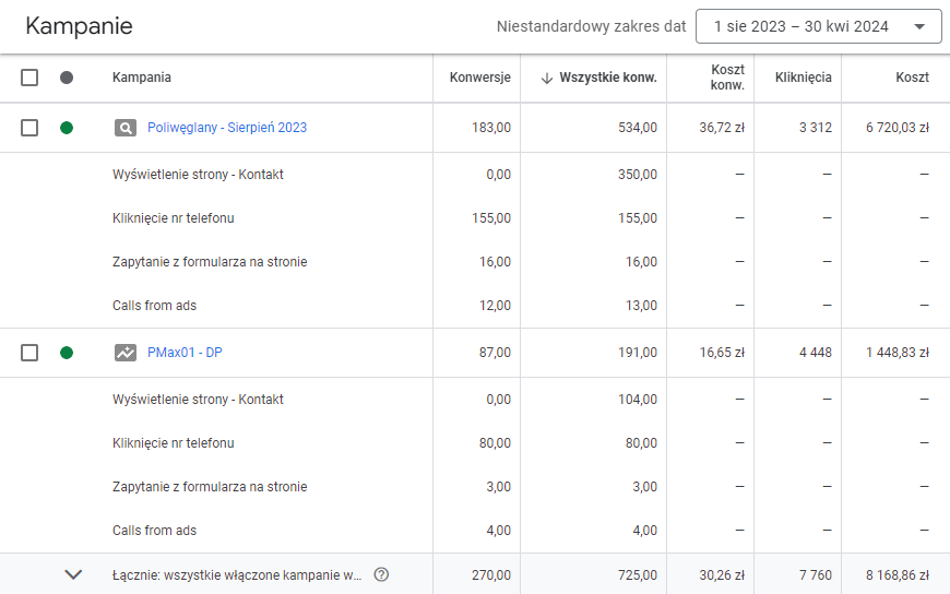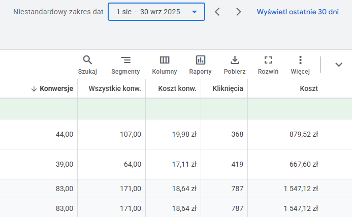 Tak. W prosty sposób pokażemy Ci, ile było wejść z reklam, ile zapytań (konwersji) oraz jaki jest mniej więcej koszt pozyskania jednego klienta.